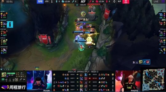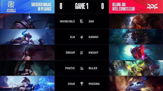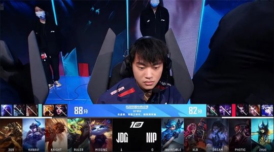 Kanavi的岩雀gank、控图两不误:先去上路抓死了格温,然后拿到了峡谷先锋。XLB的蔚还想针对下路,又被猪妹反蹲到,拼尽全力才硬换了猪妹,可是格温的发育已经炸裂,369的鳄鱼对线单吃了一血塔。猪妹把先锋放在中路,岩雀想吃镀层时才被NIP找到了破绽,NIP打出了一波0换2,本以为稳住了局势,不料Ruler的泽丽在后续小龙河道团战中斩获三杀,JDG操作拉满打出0换4,泽丽还单吃了下路一塔,发育远超“卢娜”组合。