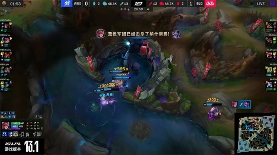 团战丝毫没有停下来的意思,WBG在中路一塔处再度发起进攻,双方第一时间互换了AD,但是后续沙皇和猴子打出了不俗的伤害切碎了WBG的阵型,奎桑提一腔孤勇一打二强行换掉两人才把战果改写成3换3。短暂休战以后两队在上半区再度爆发遭遇战,鳄鱼第一时间被打残以后撤离战场,导致进场的猴子孤立无援被集火击杀,失去打野的BLG眼睁睁看着WBG开打大龙,沙皇想要尝试干扰结果被碧波之牢命中阵亡,WBG稳稳拿下大龙Buff。回城补给状态以后WBG从中路设下埋伏锁头秒杀泽丽以后打出2换3,顺势再收下土龙魂实现双龙会。