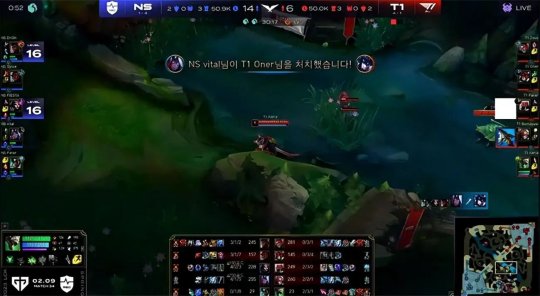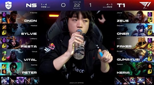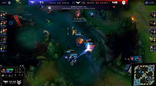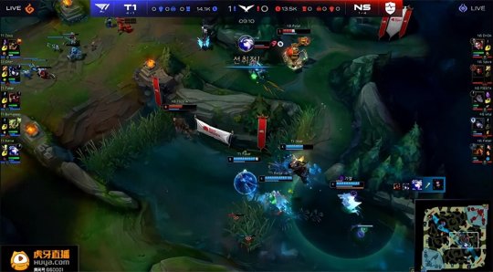 NS经此一役分寸大乱,Oner蔚先去中路抓死了塞拉斯,然后gank下路得手,泽丽再次阵亡发育炸裂。14分钟猴子帮助赛恩击杀了杰斯,NS终于收获这场比赛的第一个人头,不过“卢娜”组合推掉下路一血塔,同时T1中野拆了中路一塔完全不亏,NS拿到峡谷先锋推掉上路一塔勉强止损。T1迅速集结在中路,拆了NS的二塔并全身而退。NS则继续针对杰斯,上野又抓死了去下路单带的杰斯。大龙出生后T1兵不血刃“听牌”了土龙魂,NS的外塔仅剩上路二塔,经济落后5千。