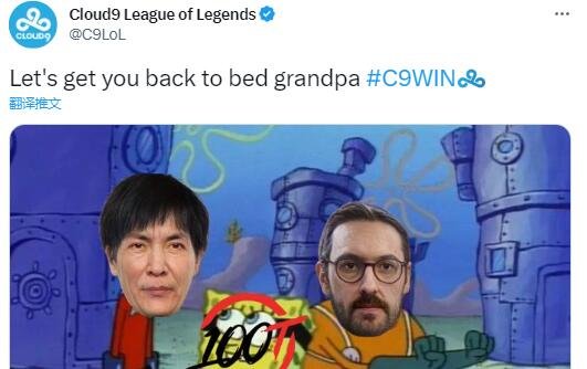 今日是LCS揭幕战,C9成功战胜了100T取得了开门红,赛后更是更新推特P图嘲讽100T:大师兄和比尔森爷爷,回去洗洗睡吧!