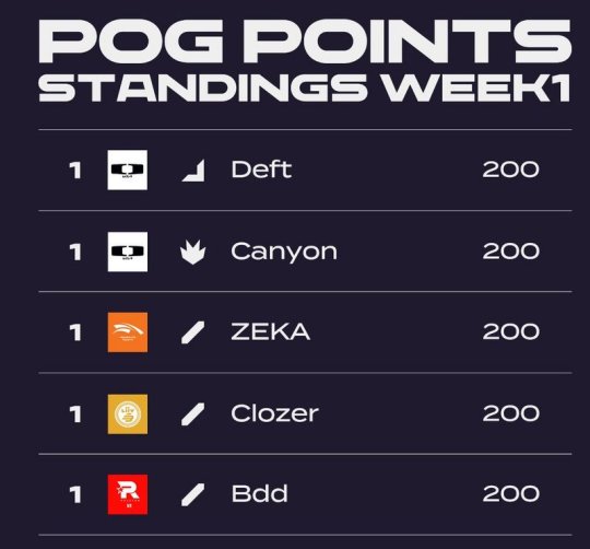 战队方面DK未丢一小局暂列联赛第一,Bro和T1紧随其后;选手POG排名方面,Deft、Canyon等五位选手同积200分: