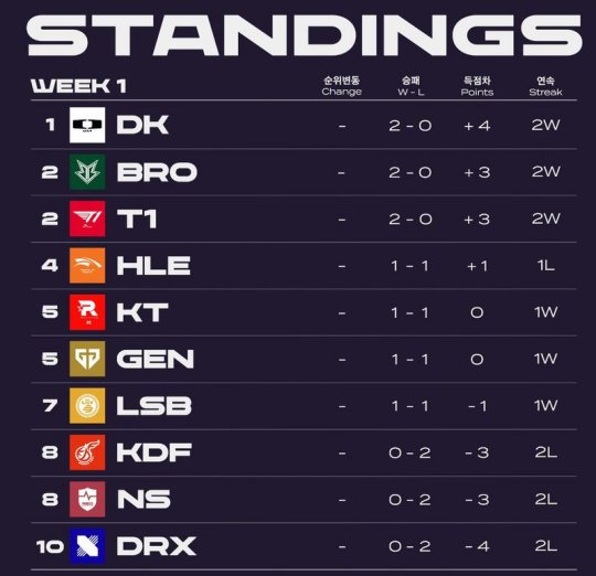 2023年LCK春季常规赛首周比赛战罢,LCK官方公布了首周战队排名以及选手POG积分榜。