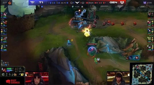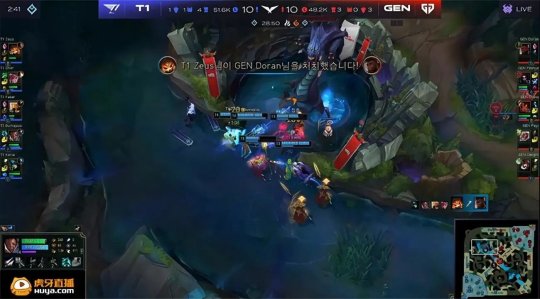 前期Peanut的蜘蛛相当活跃:第二次去上路时发现纳尔不过河道非常谨慎,马上掉转矛头直指下路,越塔三抓二和卢锡安互换倒地,复活之后控下风龙节奏完美。岩雀升到6级和蜘蛛再次双游下路,Oner的蔚晚来一步,无奈目送下路组双双阵亡,只带走了扛塔过多的蜘蛛。双方的战术重心都在下路,因此峡谷先锋无人问津。GEN众人抢先落位小龙河道,顺利地控下了火龙,作为交换T1推掉下路一血塔,然后全员迅速转线集结在中路,推掉GEN的一塔。GEN放出先锋反推T1一塔,T1顽强地打出2换2,暂时守住了一塔。大龙出生前奎桑提单吃了T1上路一塔,T1则抱团控下海克斯小龙,双方经济完全一致。