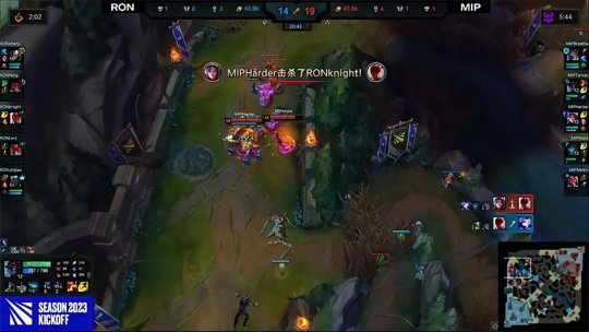 双方一级就在野区爆发团战,盲僧闪现收下一血以后惨遭击杀,残血派克疯狂逃跑最终还是被艾希发现并击杀,艾希拿到两个人头开局,两队选手前期疯狂互秀操作,盲僧更是在中路抢六将刀妹对位单杀。9分钟先锋团战RON在人手不足的情况下强行进入河道开战,结果阵型更好的MIP打出2换3并且收掉先锋。双方上单都跑到对方高地断兵线,不过卡莉丝塔击杀了炼金,而乌迪尔一路小跑躲开了追杀。RON连续几波进攻都打的非常激进,为此付出了不少人头作为代价。炼金继续贯彻送死流玩法,只要兵线不要命,双方在前期的激战十分精彩,MIP通过更好的团队调度取得了经济优势。