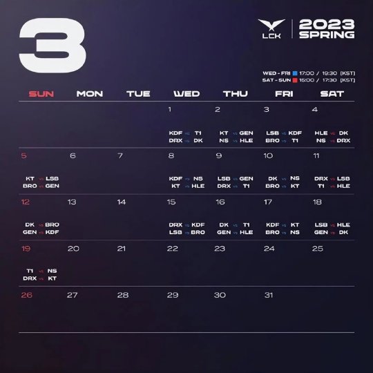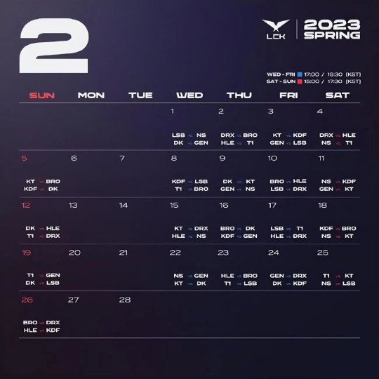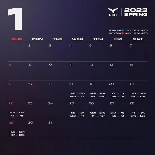 2023赛季LCK赛区春季赛的赛程安排已经出炉:1月18日下午4点的揭幕战由DK vs DRX,第二场由T1 vs GEN!比赛安排在每周三到周五,过年期间并不休赛,而是照常进行,春季常规赛结束时间为3月19日。