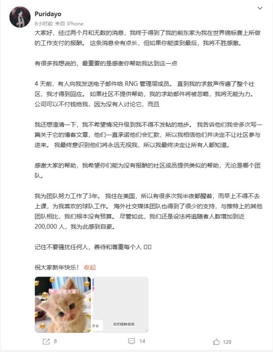 该事件在今日凌晨迎来结局,这位向RNG讨薪的国外兼职在微博发文,称RNG终于支付了自己在S12兼职期间的报酬。