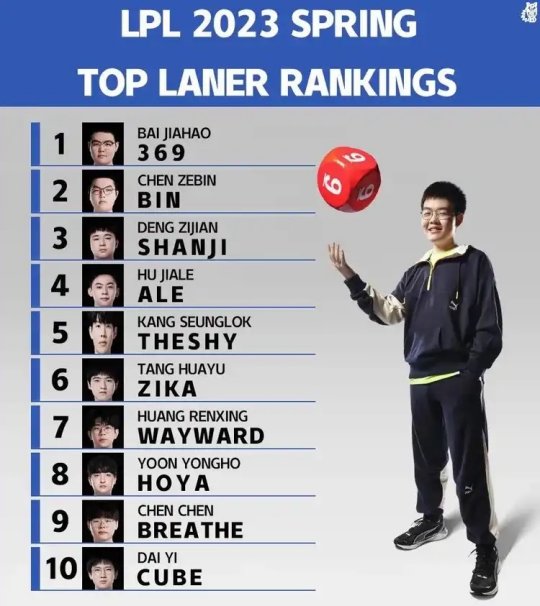 近日,外媒评选了LPL赛区新赛季的上单实力排名,其中369力压BIN排名第一,呼吸哥仅第九。