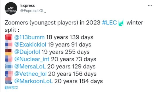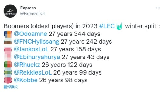 近日外媒统计了LEC赛区最年长与最年轻的选手,Excel战队上单选手Odoamne28岁344天最年长,Astralis战队新赛季的土耳其打野小将Bumm18岁139天最小。