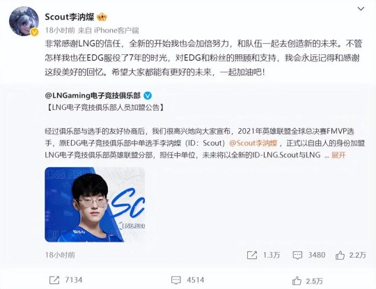 随后Scout也转发了LNG的官宣微博:“非常感谢LNG的信任,全新的开始我也会加倍努力,和队伍一起去创造新的未来。不管怎样我也在EDG服役了7年的时光,对EDG和粉丝的照顾和支持,我会永远记得和感谢这段美好的回忆。希望大家都能有更好的未来,一起加油吧!”