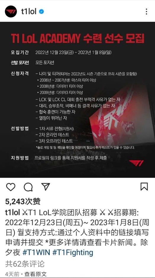 LCK赛区T1战队招募青训队伍选手,最小年龄段为2009年出生,段位达到钻3以上。
