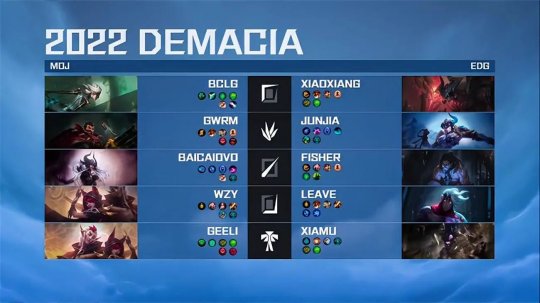 2022德玛西亚杯四分之一决赛第三场,德杯历史上首支杀入八强的业余战队MOJ即将与德杯霸主EDG争夺四强名额。EDG在本届德杯仅有上野曾在LPL登场,中下三人组面对考验没有辜负队伍的期望,虽然首局比赛MOJ凭借出色的决策能力先下一城,但双方的整体实力差距还是太过悬殊,EDG让一追三3-1击败MOJ晋级四强。