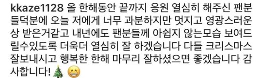 我会更加努力,明年也给粉丝们展现不可惜的面貌。大家圣诞节快乐,希望大家能收获一个幸福的年末。谢谢!”