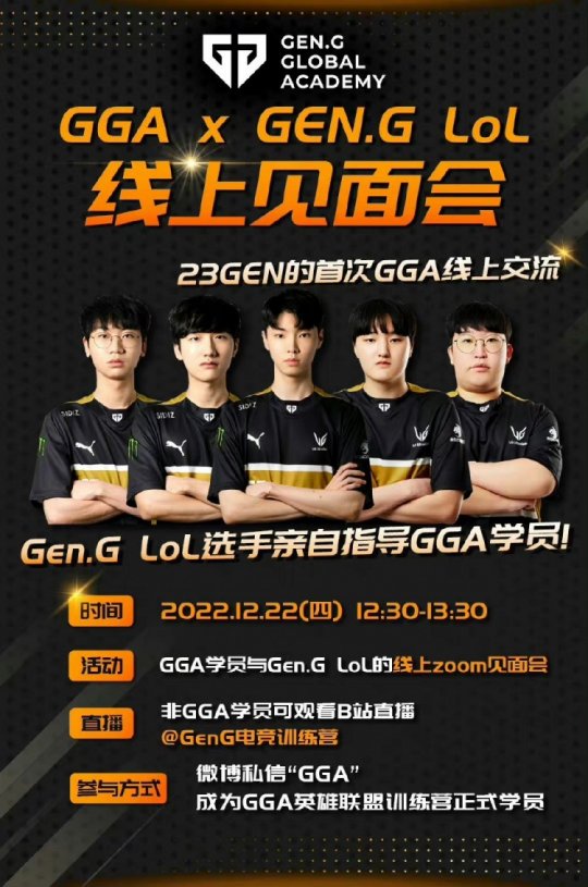 12月22日,Gen.G LoL选手将通过线上见面会形式与GGA中国学员见面,共同讨论游戏热点,指导学员意识和操作。