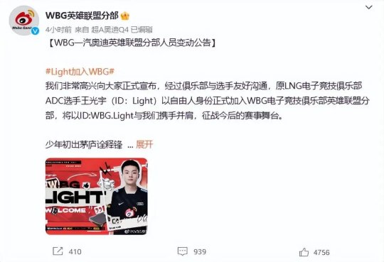 最后WBG还引入了light这名小将,这应该是除了前面四个选手之外最没有名气的选手了,但千万不要小看light的发挥。在今年的ADC表现中,light的发挥相当稳定,多次成为LNG的尽力选手。而WBG之所以引入light,就是看中了他的稳定性。而light之前搭配的辅助都是比较中庸的选手,就算是后续搭配的绿毛也只是以指挥为主,操作并不是很好。所以这一次light跟lqs的配合,还是挺值得期待的。