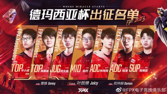 今日FPX战队公布了德玛西亚杯出征大名单,由翔掌门带领一队主力选手出战。