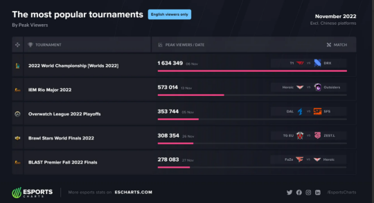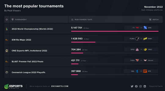 据外媒专业数据统计网站整理,在今年电竞比赛扎堆的11月份,观赛人数最多的比赛依然是LOL的世界赛决赛,也就是今年T1大战DRX的比赛,在外网的观赛人数高达515万人次,值得一提的是这个数据是电竞相关比赛历年以来最高的历史记录,而且据这家数据统计网站分析,这个数据的增长还在继续,也就是说下一年可能还会有新的历史记录诞生,而创造这个记录的应该依然是LOL的世界赛或者相关比赛。