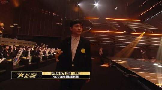 2022年LPL全明星周末-年度颁奖盛典正在进行,年度最佳教练组,由JDG俱乐部陈龙、吴硕、尹成荣获得。