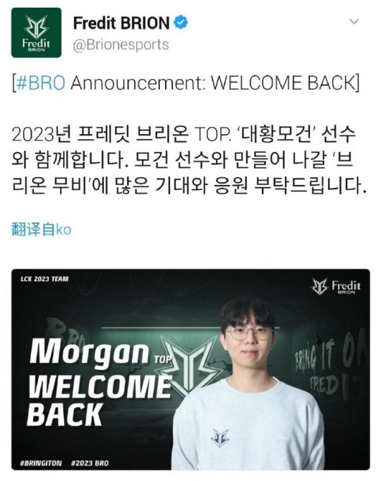 BRO官推:Morgan选手担任我们2023年的新上单 欢迎回归