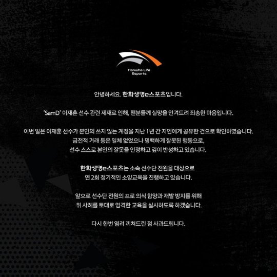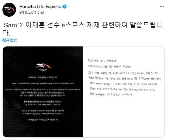今日HLE官方发布了关于Samd选手的处罚公告以及选手本人手写的道歉信。