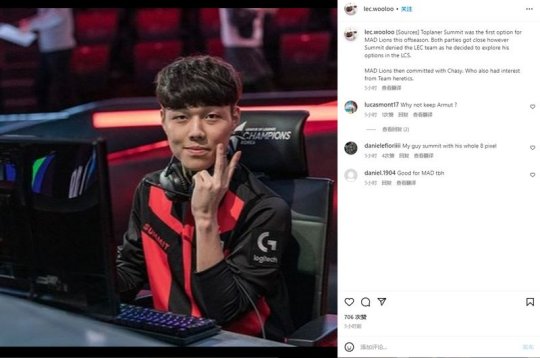 据外媒LEC Wooloo爆料,LEC赛区MAD战队在今年休赛期的上单首选其实是目前效力于FPX的Summit。双方一度接近签约,但Summit更想去LCS队伍所以拒绝了MAD。在那之后MAD才考虑了前DK二队上单Chasy。
