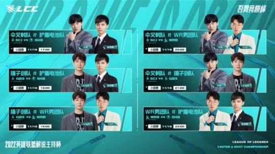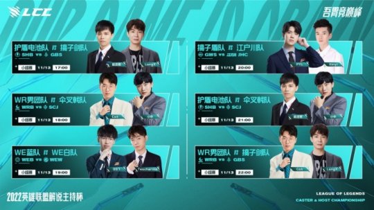 2022英雄联盟解说主持杯11月12日17点正式开打,8支队伍分为AB两组进行双循环BO1比赛,每组前2晋级。2022英雄联盟解说主持杯小组赛赛程安排如下: