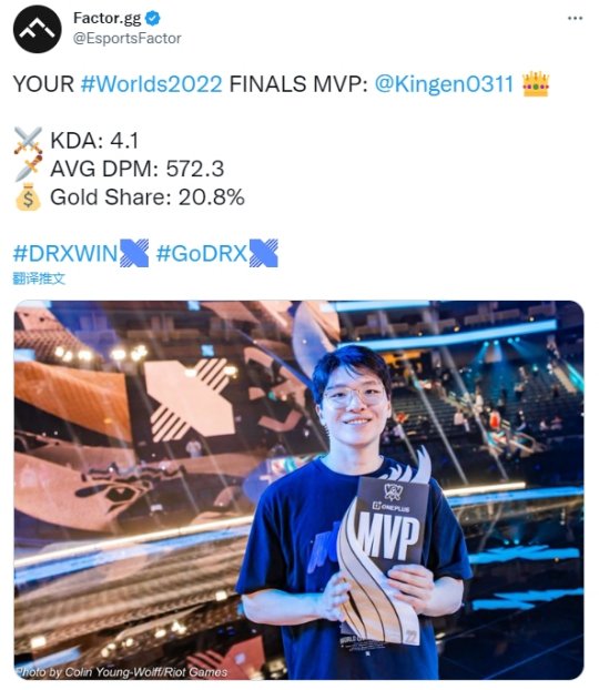 S12全球总决赛落下帷幕,DRX击败T1拿下冠军,外媒EsportsFactor发布了FMVP DRX.Kingen世界赛决赛数据: