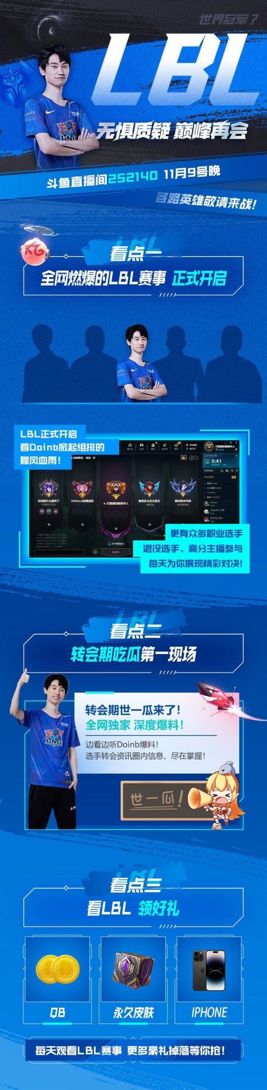 随着世界赛落下帷幕,doinb组织的LBL赛事将再次起航,斗鱼官方也发布了Doinb新闻发布会的预告,11月9日LBL自定义将再次开启。