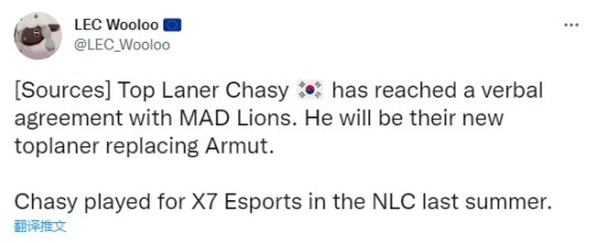 今日外媒爆料前DK青训上单Chasy与MAD达成口头协议,新赛季将取代Armut成为他们的新上单。