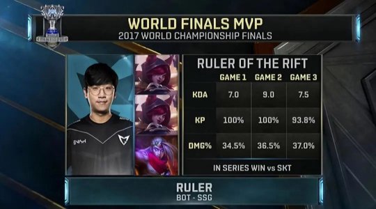 屈居S6亚军的SSG在2017年重整旗鼓,半决赛3-1淘汰LPL三号种子WE,和SKT再度会师决赛,这次“鸟巢”的欢呼声和全世界玩家的目光终于聚焦在SSG的选手们身上——SSG在决赛打出3-0零封复仇SKT,并且打破了SKT拿到S赛第四冠的幻想。SSG的ADC选手Ruler在第三局操刀韦鲁斯,于中路闪现R开到Faker卡尔玛的一幕和赛后Faker掩面哭泣的场景并称S7两大“名场面”,FMVP得主Ruler选择霞作为冠军皮肤。