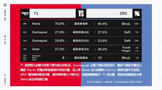 DRX整体相对更加均衡,虽然同样是以下路为主,但数据要略低于T1同位置,很多时候都是由中单Zeka站出来接管比赛。T1与DRX谁将摘得最后的桂冠,尽请期待!