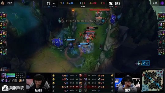 陷入绝境的DRX这一场的攻势相当凌厉,下路组升到3级先手对拼,不过烈娜塔的闪现Q落空,T1下路组果断反打,双方四人交出八个召唤师技能,一番“神仙拉扯”后Keria的索拉卡拿到Deft韦鲁斯的一血。