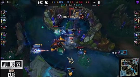 巴德在上路三角草脸探草丛遭到击杀,T1尝试逼大龙却被人马剑魔劝退,双方回到小龙坑围绕争夺各自的听牌龙,卡尔玛也脸探草丛踩到夹子惨遭击杀,DRX拿下土龙以后开团再斩韦鲁斯,不过剑魔阵亡让佛耶戈成功刷新被动也逼退了DRX,双方战成2换2。DRX找到机会在上路抓死格温以后追进野区又收掉维克托与卡尔玛,随后求稳没打大龙,转而拿下土龙魂,T1队员复活以后立刻前往做出交换,把DRX干扰的队员逼退以后拿到大龙Buff。T1抓紧利用大龙Buff再次压迫高地,人马在野区迷路遭到击杀,失去主要开团手段的DRX只能再度让掉下路高地。40分钟两队在远古巨龙展开最终决战,远古龙魂最终落入人马之手,T1上中尝试偷家被回防反杀,DRX打出0换4以后从中路众志成城一波强行推进结束了比赛,恭喜DRX完成了不可思议的超级黑马传奇,3:2战胜T1夺得2022英雄联盟全球总决赛冠军!