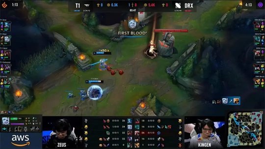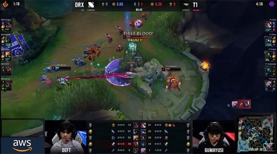 开局双方都摆出了“一字长蛇阵”,T1在上、下路河道做好了防守视野,两队打野都从自家野区起手。Pyosik的佛耶戈刷到3级反了T1的石甲虫,而Oner的男枪选择gank下路,打出韦鲁斯的闪现。Deft的韦鲁斯闪现刚刚转好,又在峡谷先锋团战中被迫交闪后撤,T1利用河道视野优势劝退了DRX,兵不血刃拿到先锋之眼。