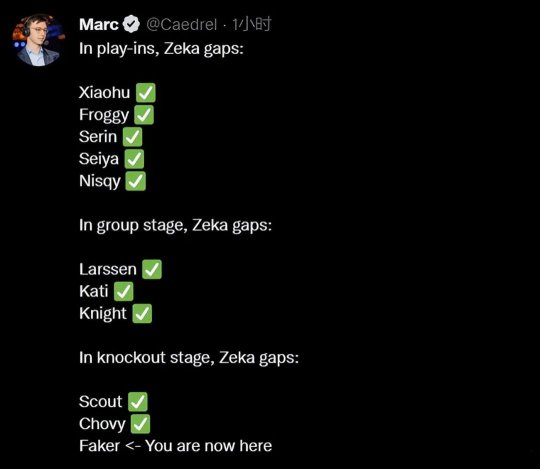 S12世界赛英文流评论员Marc在DRX淘汰GEN后发推特,更新了Zeka的“登神长阶”: