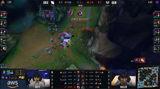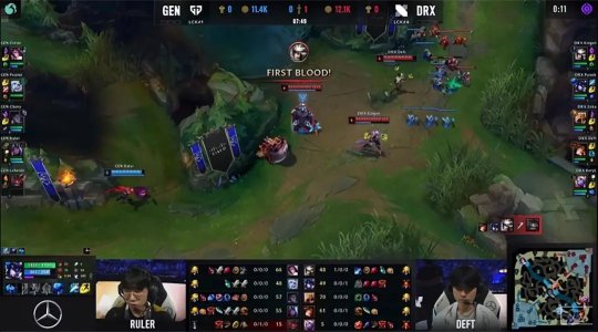 大龙出生前DRX上中野通关了上路,作为交换韦鲁斯单吃了中路二塔,塞拉斯也单带通关了下路,GEN的经济仍然领先5千。由于DRX中、下两路兵线压力太大,只能把风龙拱手让给GEN,然后两队进入漫长的发育期,直到25分钟又在大龙河道展开拉扯,Ruler的韦鲁斯蹲在草丛里,利用视野差开大先手留下猪妹,Chovy的塞拉斯也在左侧拉到了索拉卡,DRX野辅双双“暴毙”,GEN打出一波突如其来的0换2,无压力收下大龙!DRX中路高地塔失守,经济落后1万。最终GEN在中路打出0换5团灭DRX,1-0先下一城!
