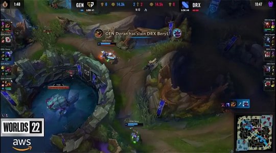 DRX这一场选出了一套相当扎实的、容错率很高的阵容,前期三线稳健发育,Pyosik的千珏相当活跃,刷到3级入侵GEN的上半野区,Chovy的瑞兹对于兵线的执念很深,加里奥得以支援到野区劝退佛耶戈,千珏反了蓝buff扬长而去,随后DRX中辅掩护千珏控下小龙全身而退。