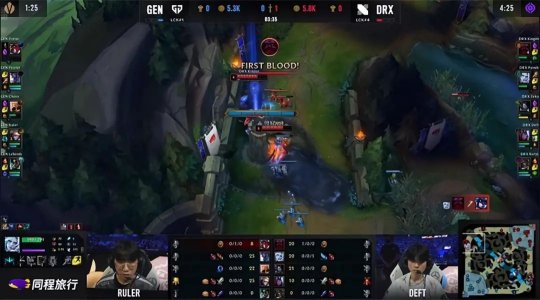 GEN没有抢到小龙,自然不会轻易让出峡谷先锋,双方从先锋河道一路拉扯到中路,泰坦不慎送出一血,Ruler的霞在队友阵亡后不退反进输出拉满,帮助GEN打出2换2拿到先锋,稳住了前期节奏,随后BeryL的布隆在小龙河道卖自己吃泰坦的控制,DRX集火反杀了泰坦,还接盘了小龙,作为交换GEN上野推掉上路一血塔。17分钟DRX抢先落位小龙河道,酒桶在下路卡住了瑞兹,双方正面形成四打四的局势,千珏没有开出大招就被融化,GEN打出1换2控下水龙。