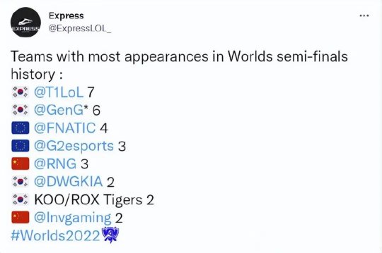 2022全球总决赛的半决赛阶段将于北京时间10月30日进行,由T1对阵JDG;10月31日DRX迎战GEN。近日外媒Express统计了参加S赛半决赛次数最多的战队:T1参加了7次排第一,包括GEN在内的“三星系”战队有6次,LPL方面RNG参加了3次,iG则是2次。