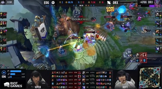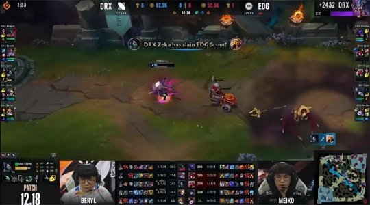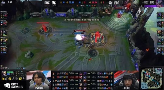 拿到一分的DRX这一场打得相当强势,下路抢到2级后将EDG双人组赶出经验区,Deft的卡莉丝塔一度压了Viper的韦鲁斯近20刀。前期EDG只有中路没被压线,猪妹利用下路的对线优势无压力控下土龙。