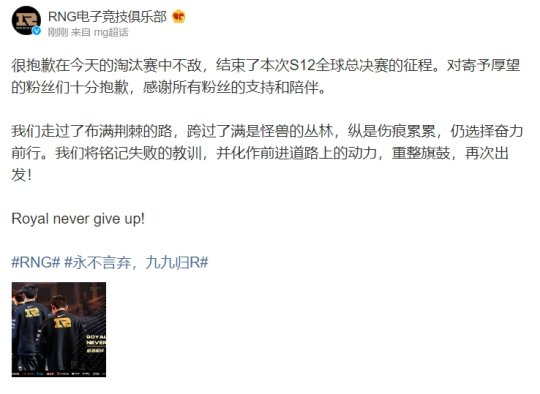 “很抱歉在今天的淘汰赛中不敌,结束了本次S12全球总决赛的征程。对寄予厚望的粉丝们十分抱歉,感谢所有粉丝的支持和陪伴。