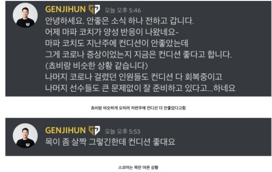 GEN团长在官方社群更新队内现况,Mafa教练确诊新冠,原文翻译如下: