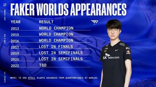 在今天的八强赛之后,LoL Esports官方推特统计了Faker选手职业生涯所参加S赛的成绩: