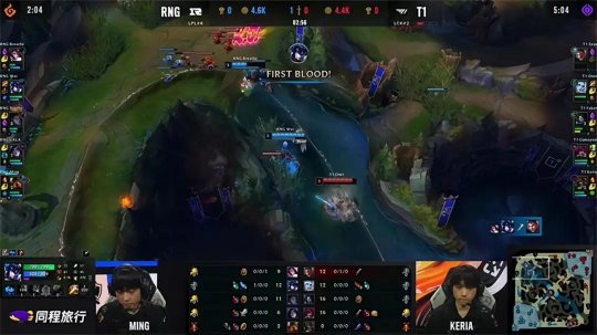 猪妹速三直接抓上,正好卡到杰斯推线的时机,Q闪果断跟进拿下了杰斯的一血,随后佛耶戈入侵野区想要反蓝也没能得手。猪妹在中路附近又一次遭遇佛耶戈,吸引来两边的中路,阿卡丽太过托大被RNG一套连招打残并且掉了闪现,猪妹趁机入侵野区反掉三狼并且又逼出佛耶戈的闪现。佛耶戈无奈前往上路想找剑姬麻烦,没想到猪妹如影随形也很快赶到,没闪的杰斯和佛耶戈在RNG上野面前毫无还手之力双双阵亡,RNG的前期节奏非常凶猛,牢牢压制住了T1,疯狂军训上路打崩杰斯以后开始展开联动扩大优势,无处不在的猪妹带给T1巨大压力。