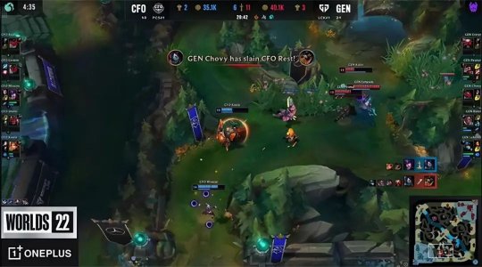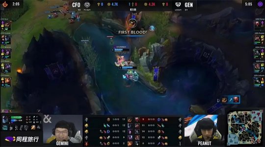 前期两队打野的侧重一目了然:大树刷到3级再次gank上路,不过CFO上野的配合极其粗糙,酒桶得以“锁血”逃生,不过男枪第二次抓下得手,GEN越塔三抓二打出0换2节奏起势。大树支援下路时又被男枪反蹲到,同时阿卡丽游走到上路,GEN上、下齐开花打出1换3,CFO的前期节奏炸裂,男枪顺利地控下火龙加峡谷先锋。13分钟“卢娜”组合推掉CFO下路一血塔,同时GEN上、中想要越塔强杀辛德拉,Mission的辛德拉天秀E推开阿卡丽,和Chovy的阿卡丽互换倒地,一打二完成对位单杀!
