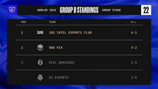 2022英雄联盟全球总决赛小组赛B组出线战已经全部结束!恭喜JDG与DK两支队伍获得晋级淘汰赛的资格。在今天的比赛里G2基本复刻了昨天FNC的低迷表现,首局被LCS队伍击败以后先后被中韩战队碾压,用一个三连败告别了全球总决赛的舞台。而EG虽然战胜G2拿到了首胜,但最终还是积重难返,与G2同为1胜5负的战绩淘汰出局。DK正面复仇JDG获得了加赛资格,但在加赛里被369的霸天剑魔暴力翻盘,JDG六胜一负锁定B组头名。