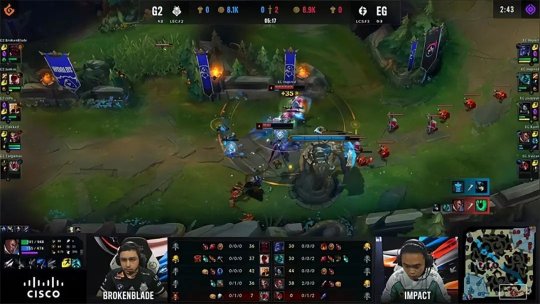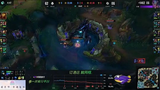 EG高歌猛进持续扩大优势,而G2全线颓势始终无法找到机会,在EG的凶猛压制下劣势越来越大,20分钟已经落后了9千经济。沙皇和盲僧在上路尝试针对阿卡丽但伤害不足,EG援军赶到轻松反杀盲僧,而沙皇千里逃亡到下半野区被锤石灯笼丝血救走。G2选择击杀小龙止损,而EG大部队已经抱团拿下大龙Buff,接下来G2即将面对EG巨大装备优势下展开的大龙Buff攻势。EG严谨地抱团推进拆塔,把G2彻底压制在高地之上。G2在上路找到唯一的机会集火阿卡丽终于拿到首杀,但是随后面对EG的反扑还是土崩瓦解丢掉了三路高地塔。