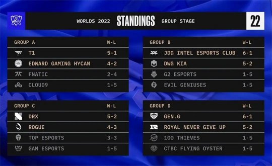 2022英雄联盟全球总决赛小组赛D组出线战已经全部结束!恭喜RNG与GEN两支队伍获得晋级淘汰赛的资格。之前表现不佳的100T与CFO依然在面对GEN与RNG时毫无招架之力,最终双双1胜5负提前出局。D组的唯一悬念就剩下RNG能否拿下小组第一。身为四号种子的RNG在赛前全员阳性导致无法正常进行训练,但还是顶住压力带兵上阵拿到了淘汰赛资格。GEN则愈战愈勇,复仇RNG以后又在加赛里完成对RNG的双杀,最终拿到了D组第一。