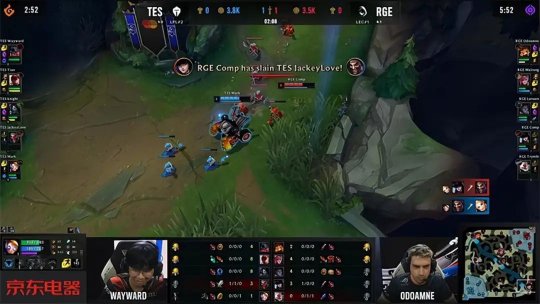 机器人对线期一级钩到拉克丝,德莱文直接骑脸输出拿下一血,随后自己也被女警换掉了人头。盲僧前期来到下路护航,机器人趁着RGE双人组推线又闪现钩到女警将其击杀,同时上路剑魔也对位打出了纳尔闪现,TES三路对线优势取得了明显的领先,德莱文也快速滚起了雪球。TES早早下路穿线推塔以后把双人组换到中路,机器人开始跟随队友游走进入野区,带给RGE极大的防守压力。TES围绕强势的双人组展开拆迁模式,连续拔掉RGE四座防御塔,很快就领先了近6千经济。