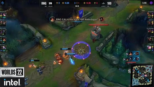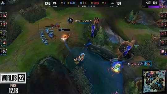 2022英雄联盟全球总决赛小组赛C组出线战第三场比赛,RNG战队迎来他们第二轮比赛的首个对手100T,只需拿下一场胜利他们就将提前锁定晋级淘汰赛的资格。面对100T来势汹汹的团战阵容,RNG沉着冷静利用分推拉扯,并且抓到了100T在两波大龙团战犯下的严重失误打出完美团战,有惊无险地拿下了胜利以及晋级淘汰赛的资格!