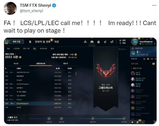 前FPX、TSM辅助Shenyi更推求职:自由人了, LCS/LPL/LEC战队请联系我!我准备好了!!!迫不及待想要在赛场上亮相了。